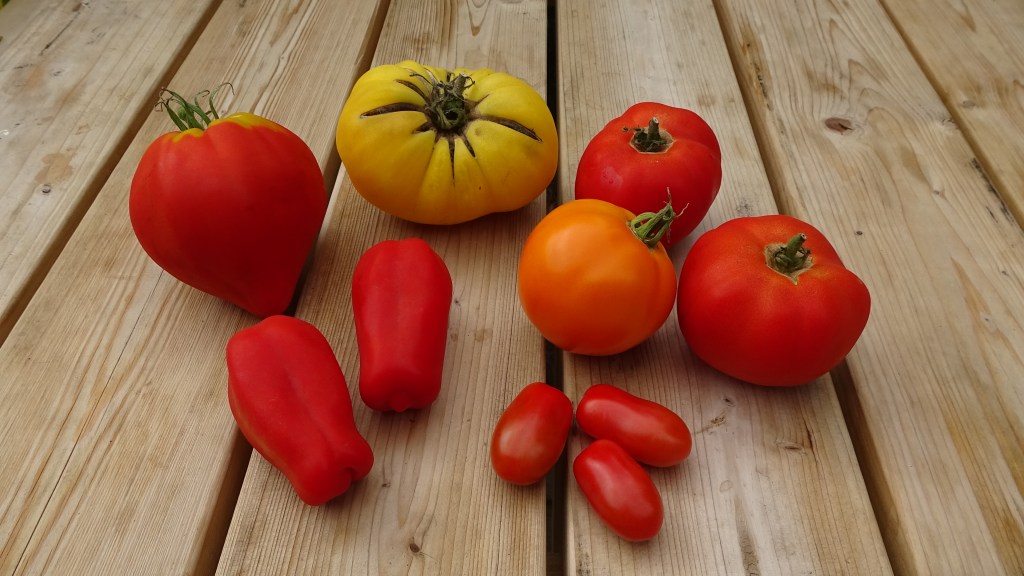 Hier in mijn tuin heb ik een tunnelserre waar ik zelf onder meer tomaten kweek. Sinds vorige maand kon ik mijn tomaten beginnen oogsten. Hierboven zie je er een paar. Snoeptomaten, lange tomaten, Coeur de Boeufs,… De formaten verschillen sterk. Ook zijn er diverse kleuren: geel, oranje en rood… Edoch, de planten zien er in principe allemaal vrij gelijkaardig uit. Is die snoeptomaat nu een andere soort dan die Coeur de Boeuf? Neen. Bij tomaten spreken we van variëteiten of rassen, en niet van soorten. Het gaat hier om één en dezelfde soort met de wetenschappelijke naam Solanum lycopersicum. En wat een variatie binnen die soort!