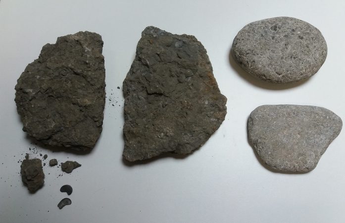 Een fragment van het gesteente van Audresselles (Jura, ca. 150 Ma) bovenop een vensterbank van arduin (Devoon, ca. 360 Ma).