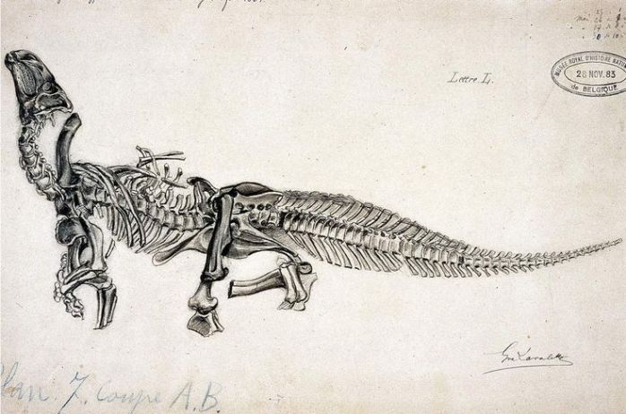 [3] Edouard Dupont, Sur la découverte d’ossements d’Iguanodon, de poissons et des végétaux dans la fosse Sainte-Barbe du charbonnage de Bernissart – Bulletin de L’Académie royale des Sciences, des Lettres et des Beaux-Arts de Belgique (1878). Via: CORDIER Sandra – De botten van de Borinage, de iguanodons van Bernissart, van 125 miljoen jaar voor Christus tot vandaag, Uitgeverij Vrijdag, Antwerpen, 2016