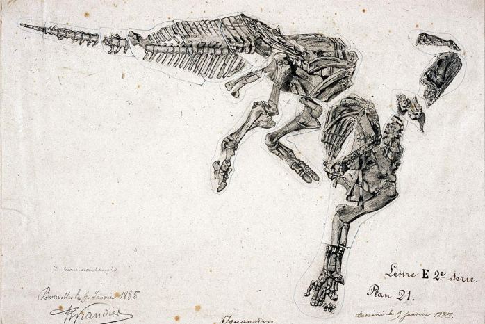 Originele tekeningen door Gustave Lavelette van de iguanodons van Bernissart, zoals ze werden gevonden in het sediment in de steenkoolmijn: