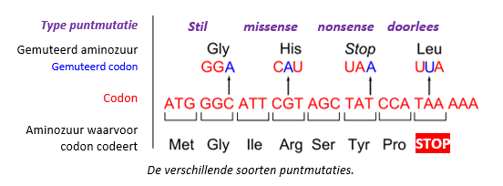 Onze genetische informatie is gigantisch veel groter dan de genetische informatie in een bacterie of een eukaryote ééncellige. Ongerichte mutaties, ofwel beschadigingen van het DNA, zouden die nieuwe informatie geleverd moeten hebben. Er zijn twee soorten mutaties mogelijk in een levend organisme: de erfelijke mutaties en de verworven somatische mutaties. En in het DNA zelf heb je 3 soorten mutaties: de puntmutatie, de insertiemutatie en de deletiemutatie. Bij de puntmutatie wordt een nucleotide gewijzigd in een ander nucleotide, waardoor het codon wijzigt en mogelijks voor een ander aminozuur zal coderen, waardoor het eiwit kan veranderen of een defect kan hebben.