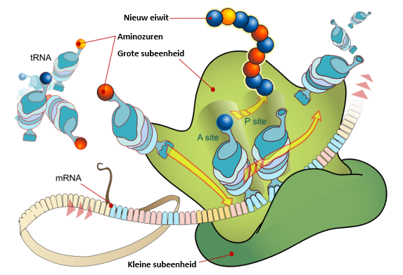 Vervolgens staat het ribosoom (ook een eiwit) in voor de vertaling van het mRNA naar een eiwit. Daarbij komt ook tRNA (transport-RNA) aan te pas, waar een welbepaald aminozuur op gebonden is, dat overeenkomt met een welbepaald codon (dat codeert voor dat aminozuur) op het mRNA. Er wordt een keten van aminozuren gemaakt. De keten van aminozuren wordt vervolgens opgevouwen tot een eiwit. Dit proces heet translatie (de vertaling van de informatie op het mRNA naar een eiwit).